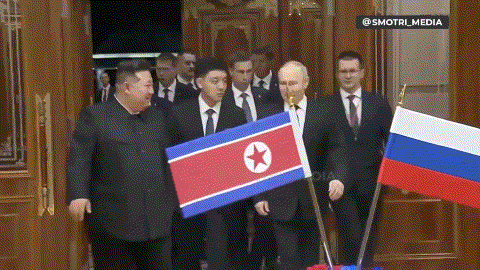 【朝鲜“国宾护卫队”最高规格护送普京,路旁挂满普京巨型照片】在接机仪式之后,普京和金正恩同乘奥鲁斯汽车从机场出发前往会场。这次朝方接待普京的规格相当高,最高的就是金正恩亲自接机了。而朝鲜“国宾护卫队”的摩托车规模应该也到顶了,视频太模糊不太好数数。参照之前普京来华,我方是出动了21辆大摩托,是接待外国元首的最高规格,没有之一。朝鲜的护卫队规模应该也差不多。20来辆摩托车组成箭形编队护送普京车队,路旁挂满了俄罗斯国旗和普京巨幅照片,路旁站岗执勤的士兵也不少,种种细节,全方位给足了普京面子。